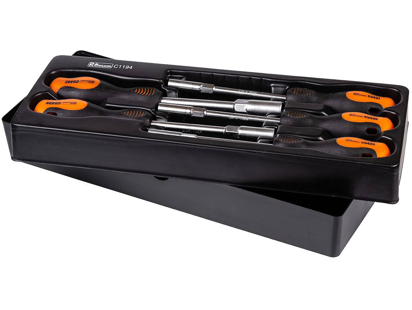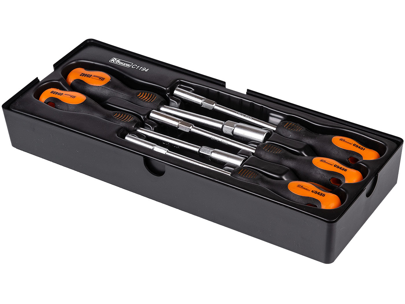 Zestaw 5 sztuk wkrętaków nasadowych umieszczonych we wkładzie do wózka warsztatowego typu A.