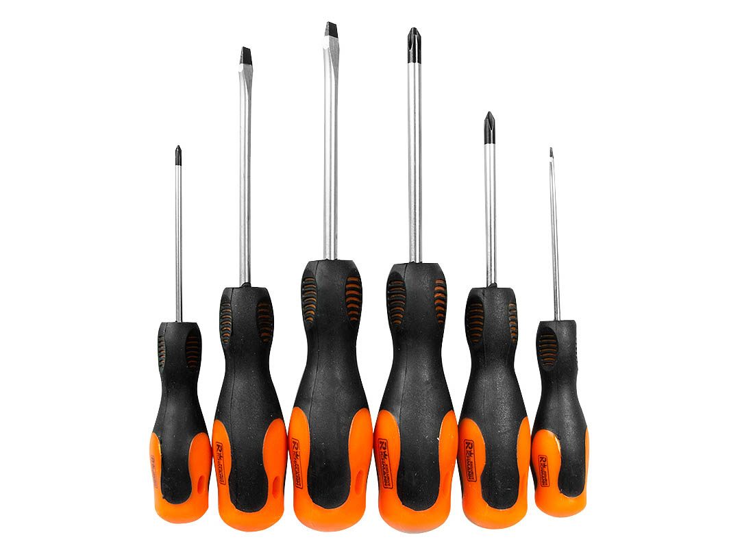 Zestaw zawiera 6 sztuk wkrętaków płaskich oraz krzyżakowych (Phillips).
