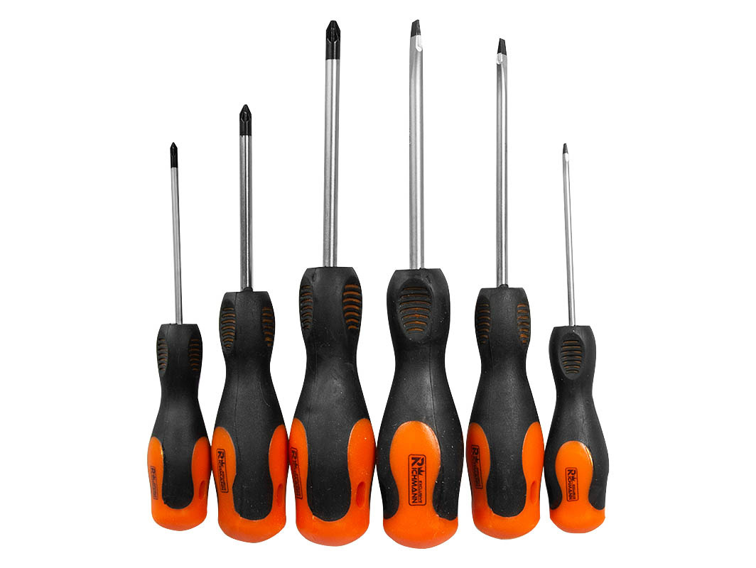 Zestaw zawiera 6 sztuk wkrętaków płaskich oraz krzyżakowych (Pozidriv).