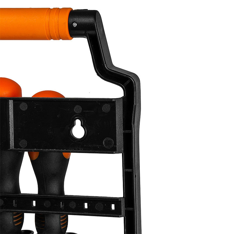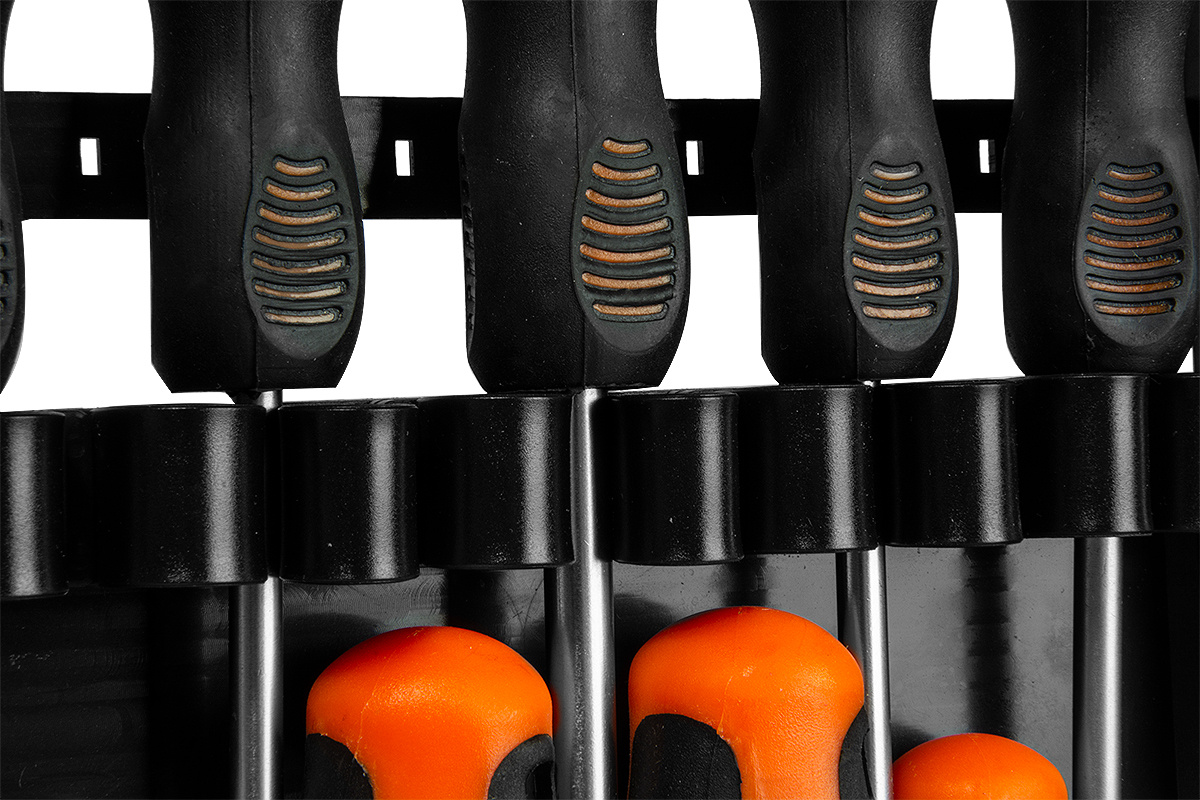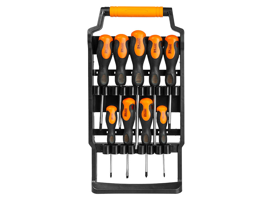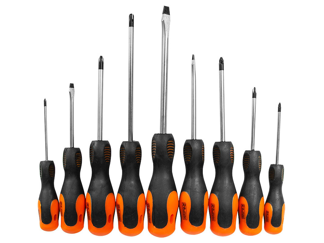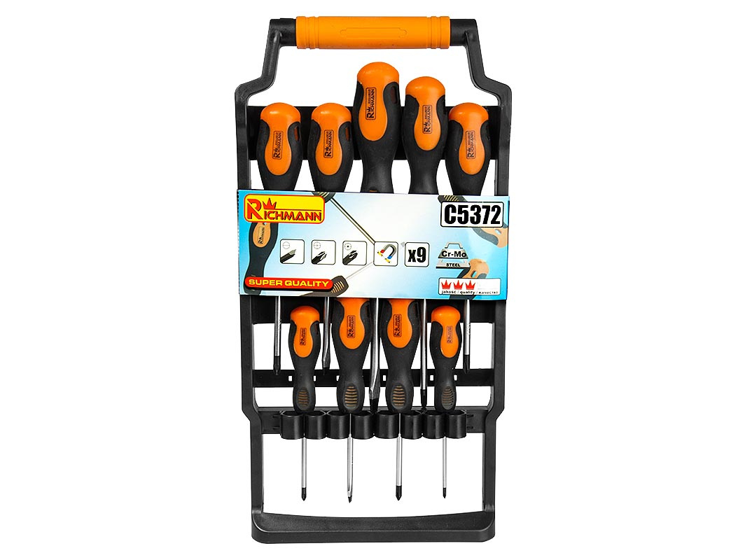 Zestaw zawiera 9 sztuk wkrętaków płaskich oraz krzyżakowych umieszczonych w plastikowej zawieszce.