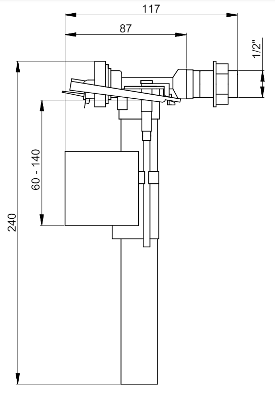 Zawór spłuczki napełniający boczny z białym gwintem 1/2", przeznaczony do instalacji w spłuczkach ceramicznych i z tworzywa. Regulowany w zakresie 60 mm-140 mm, pasuje do większości spłuczek dostępnych na rynku (np. KOŁO, CERSANIT, INTER-SANO). Całkowita wysokość zaworu: 240 mm.