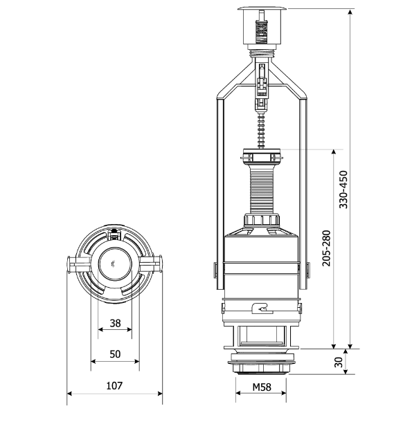 - Regulowana wysokość: Zawór przeznaczony jest do kompaktów o wysokości od 330 do 420 mm, co zapewnia duży zakres nastawiania wysokości.