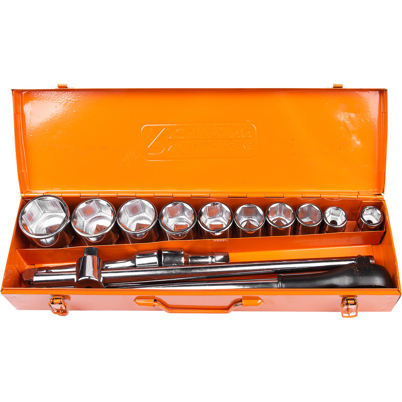 14 elementowy zestaw kluczy nasadowych 6-kątnych z grzechotką 3/4" w zakresie rozmiarów 22-50 mm.
