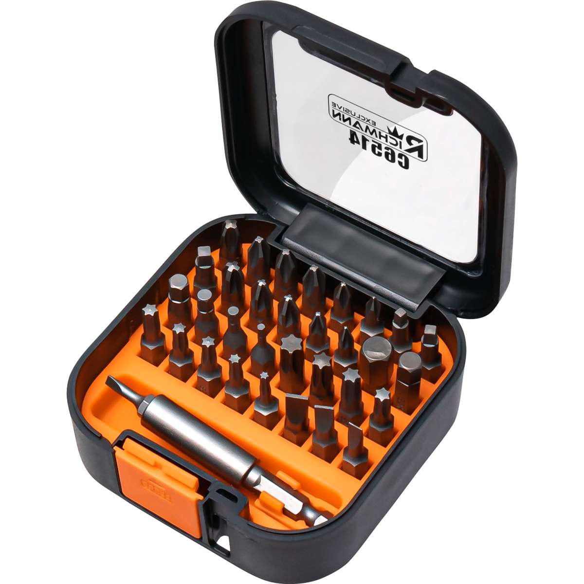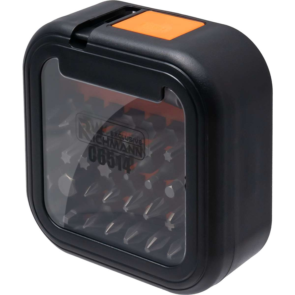 32 szt. bitów ¼” 25 mm: SL3, SL4, SL5, SL6, PH1, 3xPH2, PH3, PZ1, 3xPZ2, PZ3, H2, H3, H4, H5, H6, H8, T9, T15, 2xT20, 2xT25, T27, T30, T40, SQ1, SQ2, SQ3