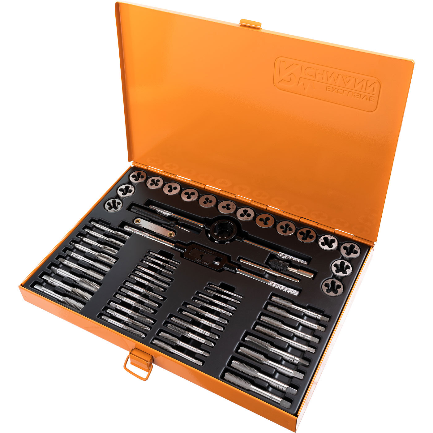 Duży zestaw gwintowników i narzynek, metryczne + drobnozwojowe w zakresie M3-M12 złożony z 60 elementów.