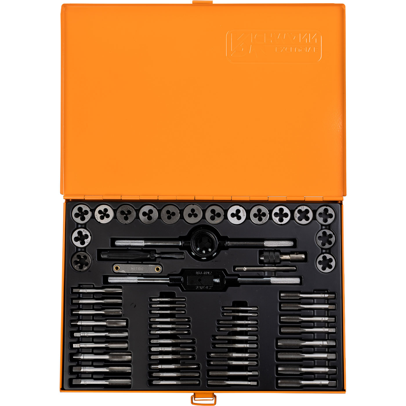 Komplet zawiera m.in.: gwintowniki metryczne, drobnozwojowe, narzynki, pokrętło do gwintowników, oprawkę do narzynek, gwintomierz oraz wkrętak.