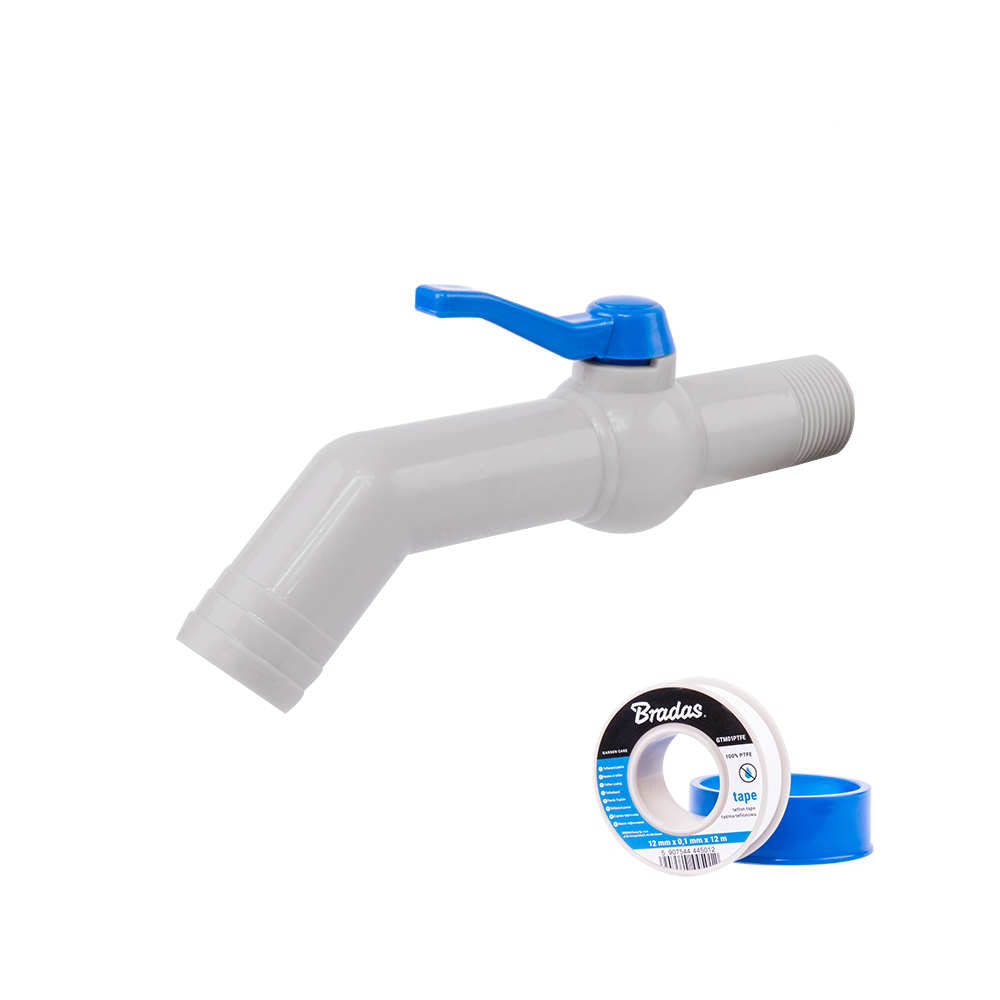 Zestaw - Kran PP 45° 1'' na wąż 32mm, dł. 20cm, z taśmą PTFE