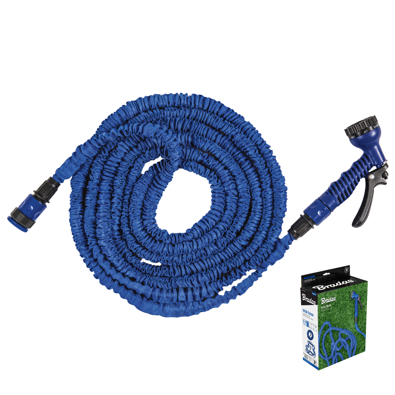 TRICK HOSE- zestaw ogrodowy. Bardzo lekki, nie załamuje sie i nie plącze. Po napełnieniu wodą zwiększa swoja długość trzykrotnie. Po odcięciu zasilania wody sam wraca do pierwotnej długości. Wąż może pracować pod ciśnieniem wody do 4BAR. Kolor niebieski. W zestawie:- dwie szybkozłączki - przyłącze na kran 1/2" z redukcją na 3/4" - pistolet 7-funkcyjny