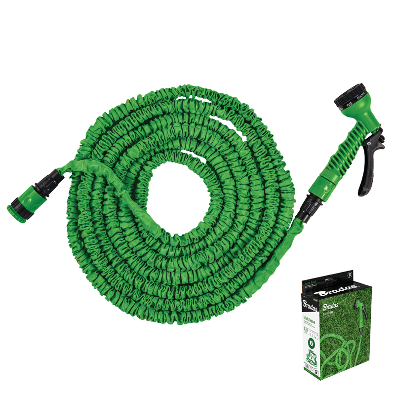 TRICK HOSE- zestaw ogrodowy. Bardzo lekki, nie załamuje sie i nie plącze. Po napełnieniu wodą zwiększa swoja długość trzykrotnie. Po odcięciu zasilania wody sam wraca do pierwotnej długości. Wąż może pracować pod ciśnieniem wody do 4BAR. Kolor zielony. W zestawie:- dwie szybkozłączki - przyłącze na kran 1/2" z redukcją na 3/4" - pistolet 7-funkcyjny