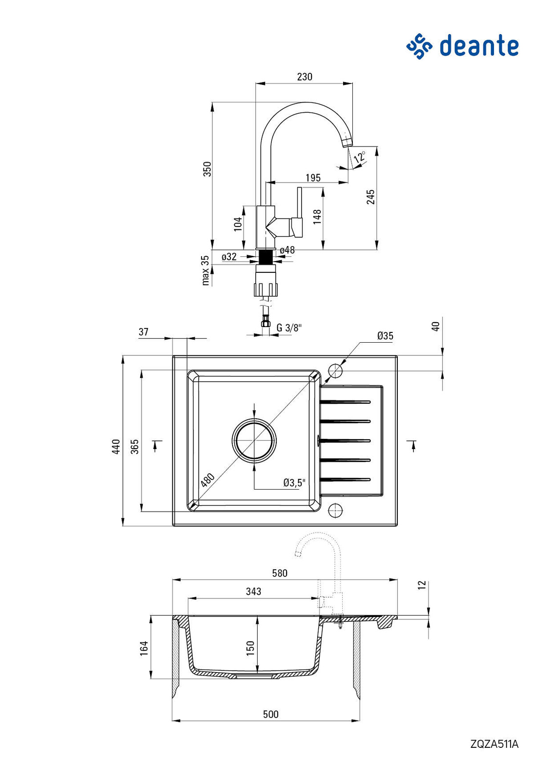 Zlewozmywak granitowy z baterią 1-komorowy z ociekaczem obrotowa alabaster alabaster Zorba ZQZAA11A