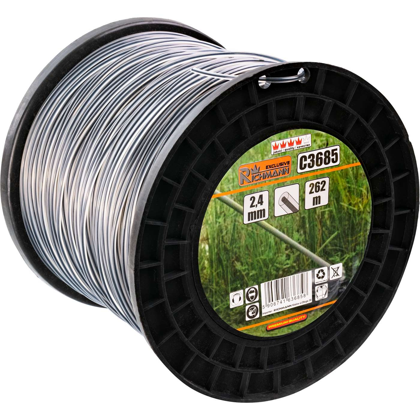 Żyłka o długości 262 m nawinięta na szpulę o średnicy 180 mm.