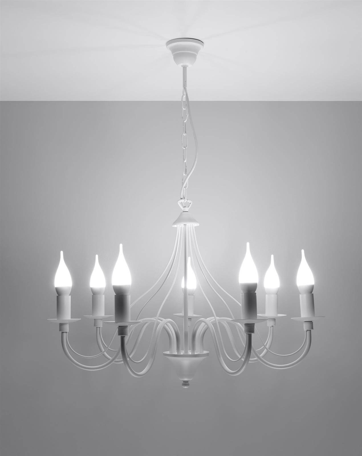 - Źródło światła: E14, 7x40W, 7x12W LED, 50-60Hz, ~220-230V, IP20, klasa ochronności IŹródło światła nie jest w komplecie.Wymiary: 60/60/80 cmMateriał: stalKolor: biały