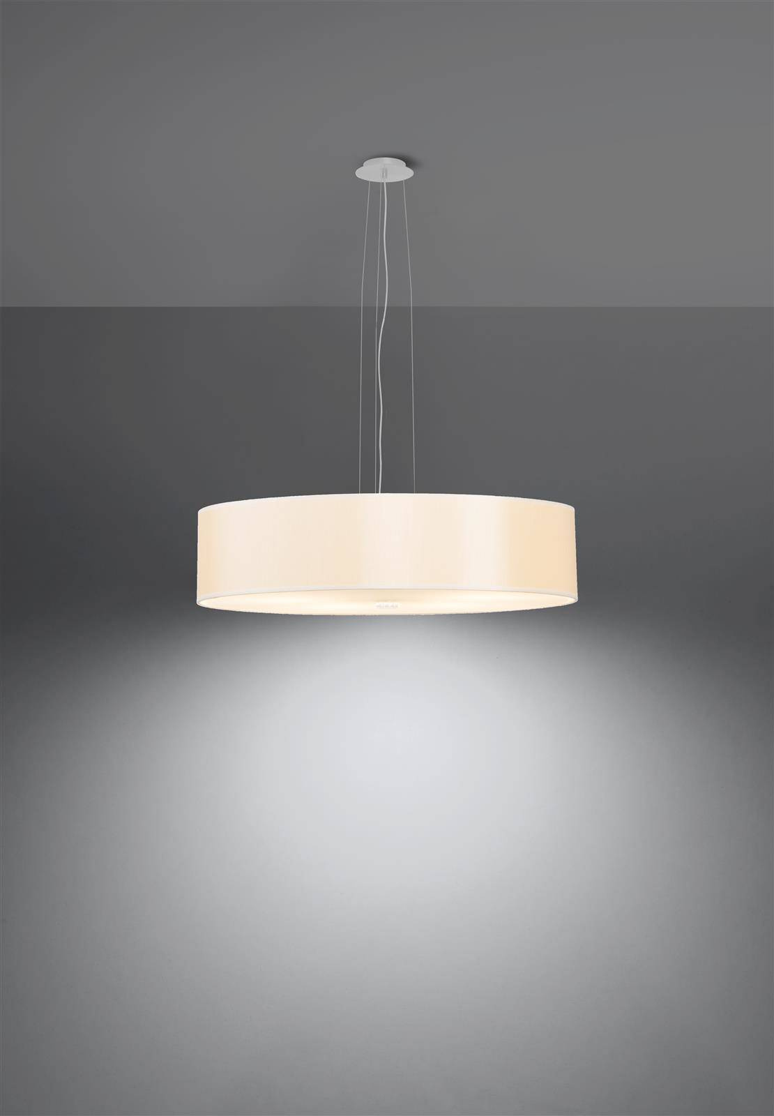 - Źródło światła: E27, 5x60W, 5x15W LED, 50-60Hz, ~220-230V, IP20, klasa ochronności IŹródło światła nie jest w komplecie.Wymiary: 50/50/102 cmWymiary klosza: 50/12 cmMateriał: tkanina, szkło, stalKolor: biały