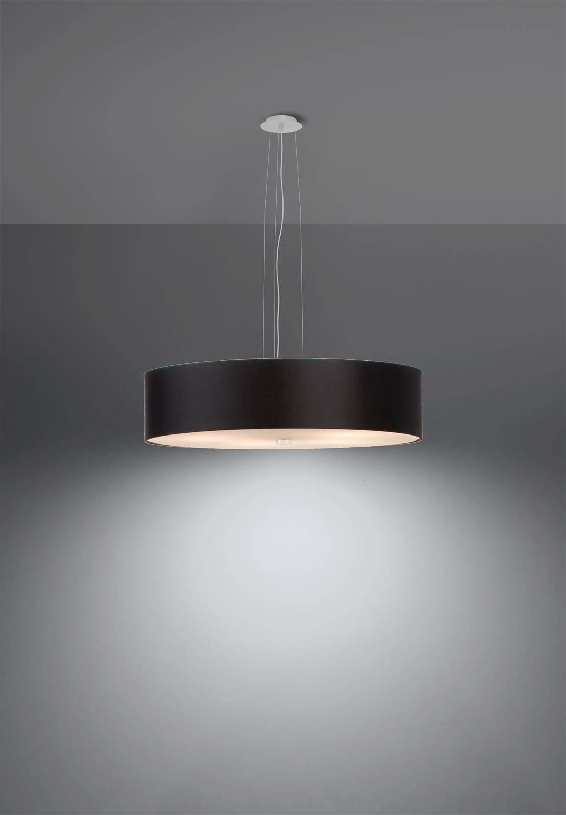 - Źródło światła: E27, 5x60W, 5x15W LED, 50-60Hz, ~220-230V, IP20, klasa ochronności IŹródło światła nie jest w komplecie.Wymiary: 50/50/102 cmWymiary klosza: 50/12 cmMateriał: tkanina, szkło, stalKolor: czarny