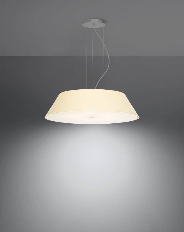 - Źródło światła: E27, 5x60W, 5x15W LED, 50-60Hz, ~220-230V, IP20, klasa ochronności IŹródło światła nie jest w komplecie.Wymiary: 60/60/105 cmWymiary klosza: 60/15 cmMateriał: tkanina, szkło, stalKolor: biały