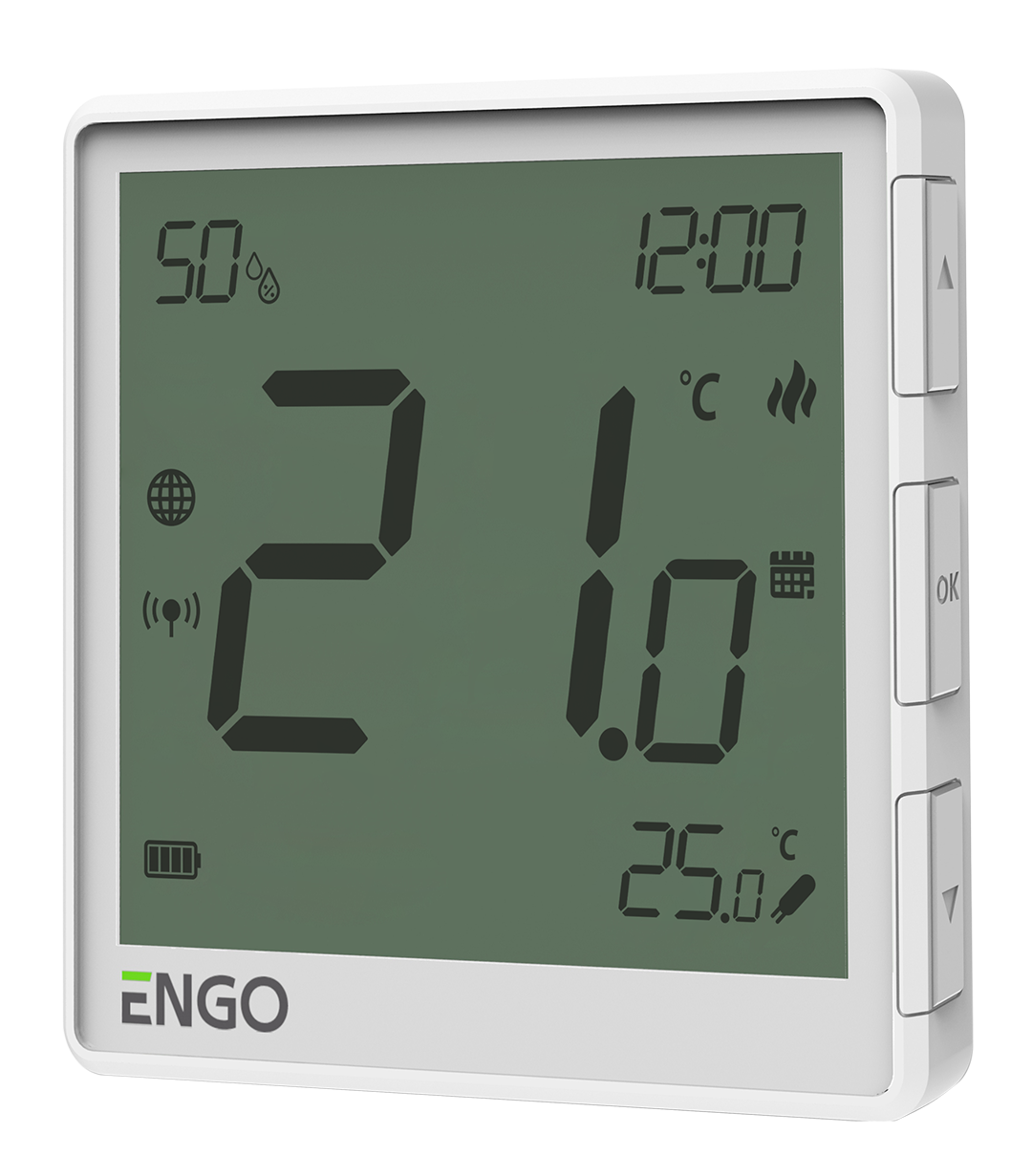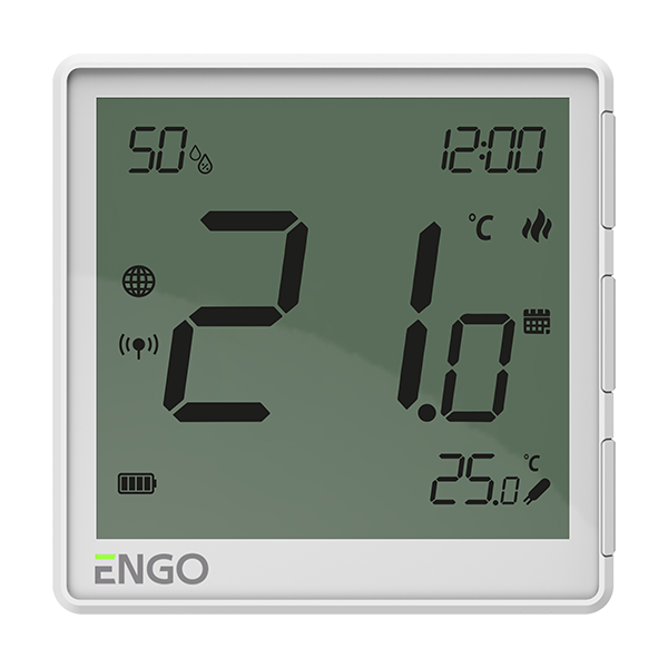 Regulator temperatury z wbudowanym czujnikiem wilgotności i funkcją komfortowej podłogi. Zapewnia sterowanie bezprzewodowe za pomocą aplikacji ENGO Smart, przy użyciu bramki internetowej ZigBee 3.0 (EGATEZB). Produkt obsługuje funkcję ENGO Binding - powiązanie urządzeń w trybie Online i Offline. Dodatkowo daje możliwość: regulacji wyświetlacza, ustawienia minimalnej i maksymalnej temperatury zadanej, podłączenia dodatkowego czujnika NTC. Pozwala na generowanie wykresów z historią temperatur. Kolor biały. Zasilanie: wbudowany akumulator Li-Ion 3,7V. Zakres regulacji temperatury: 5°C – 45°C. Algorytm sterujący: TPI lub Histereza (±0.1°C do ±2°C). Komunikacja: ZigBee 3.0 2,4GHz. Wejście S1-S2: czujnik temp. podłogi lub powietrza. Wymiary [mm]: 90 x 90 x 14.