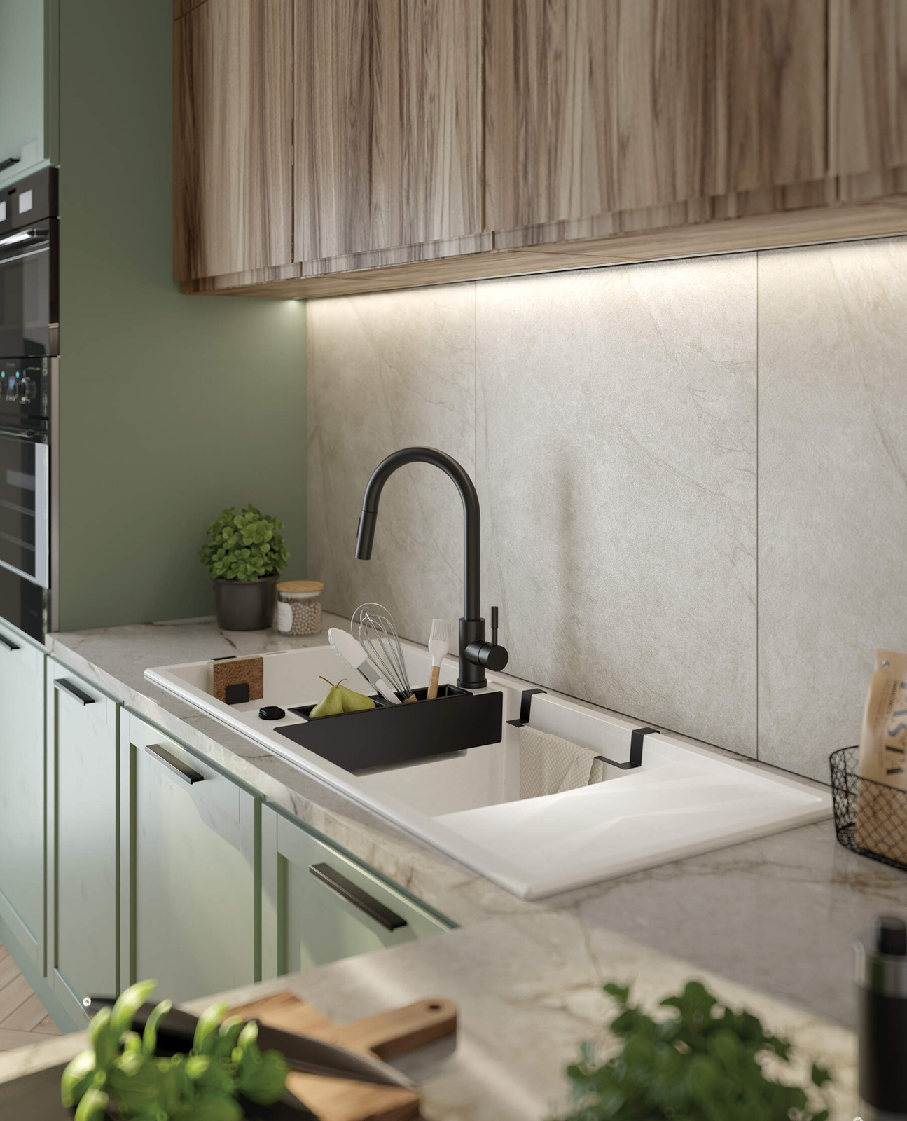 na równi z blatem, podblatowy, wpuszczany, z fartuchem